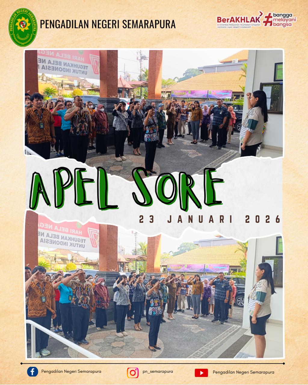 Bertempat di halaman kantor Pengadilan Negeri Semarapura telah dilaksanakan Apel Sore, sebagai Pembina Apel Hakim Pengadilan Negeri Semarapura Ibu Ratri Pramudita, S.H., sebagai Petugas Apel adalah bagian Umum dan Keuangan. Apel diikuti oleh seluruh Hakim dan Aparatur Pengadilan Negeri Semarapura. Dalam amanatnya pembina apel menyampaikan selamat berakhir pekan, tetap disiplin dan selalu mematuhi PERMA Nomor 7,8,9 Tahun 2016, serta selalu menerapkan Delapan Nilai Utama Mahkamah Agung RI, dan tetap berpedoman kepada Core Value ASN BERAKHLAK.