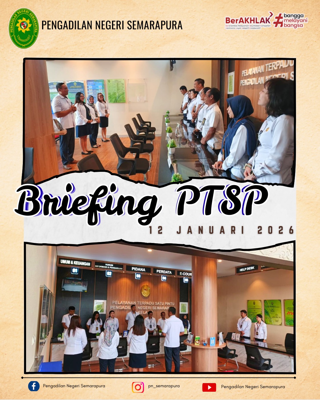 Bertempat di Ruang PTSP Pengadilan Negeri Semarapura, telah dilaksanakan Apel Petugas PTSP. Apel diikuti oleh Atasan Pengelola, Pengelola PTSP, Penanggung Jawab PTSP dan Petugas PTSP. Dalam briefing disampaikan pengarahan agar para petugas meningkatkan kualitas pelayanan karena PTSP merupakan cerminan dari Pengadilan Negeri Semarapura, selalu tersenyum dalam memberikan pelayanan, memahami standar pelayanan terbaru dan melaksanakan etika berinteraksi.