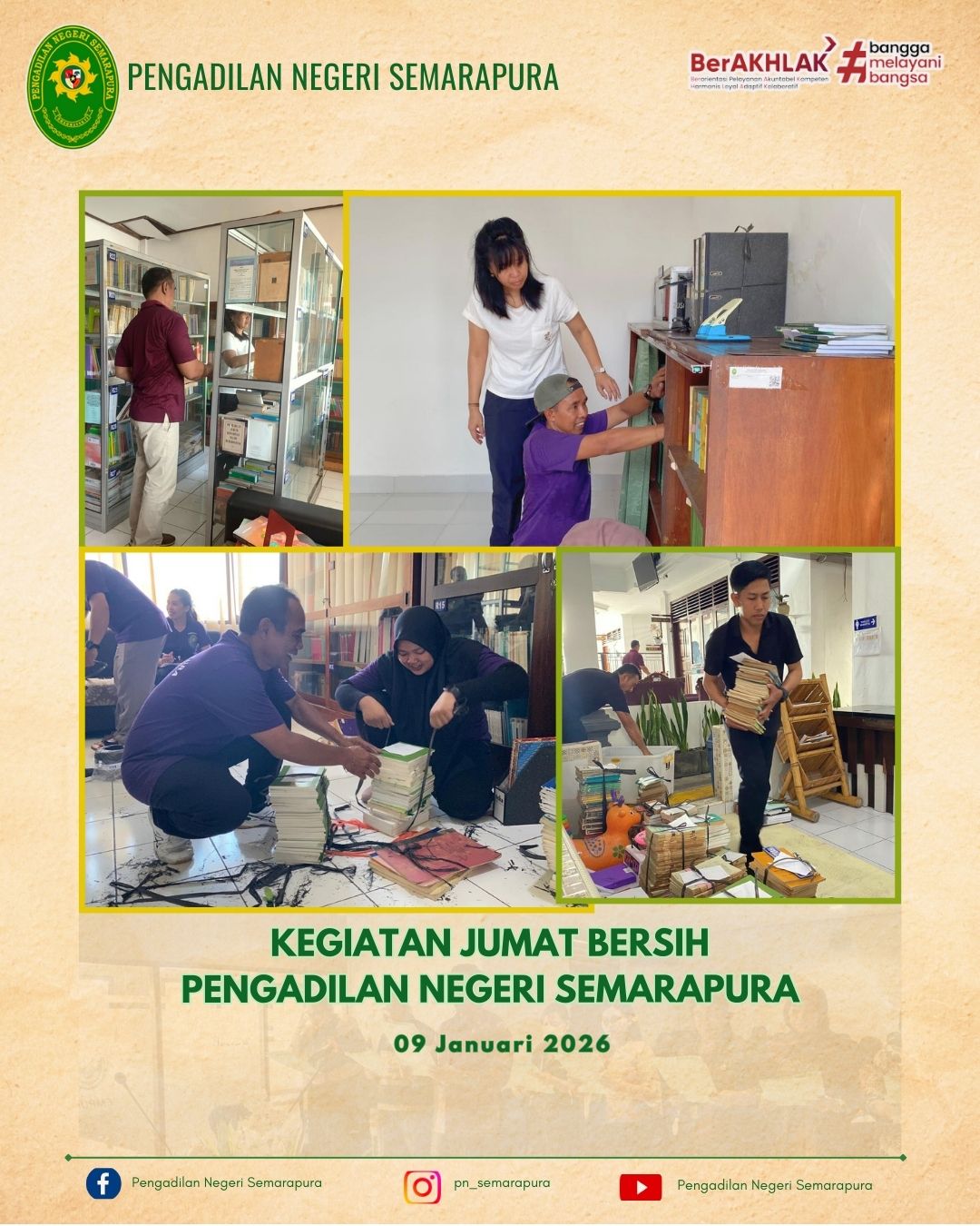 Pimpinan Pengadilan Negeri Semarapura beserta aparaturnya melaksanakan kegiatan Jumat bersih pada area perpustakaan, ruang hakim, mushola, ruang arsip dan sekitarnya.
