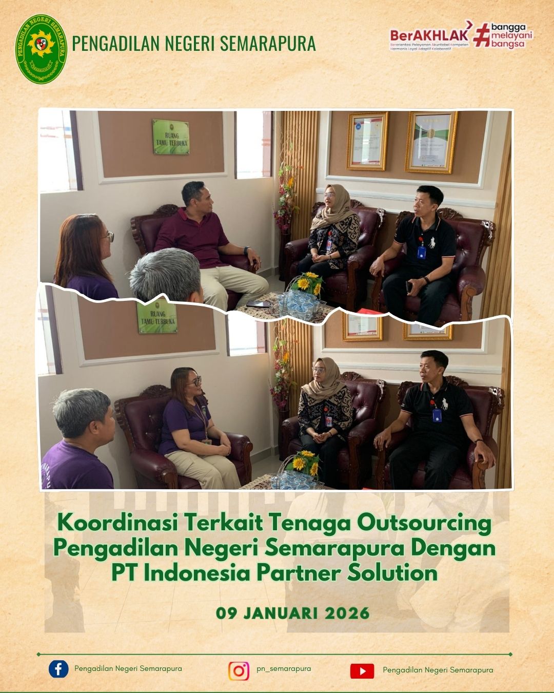 Pimpinan Pengadilan Negeri Semarapura beserta Tim, melaksanakan Koordinasi Terkait Tenaga Outsourcing Tahun 2026 dengan PT Indonesia Partner Solution, bertempat di ruang tamu terbuka Pengadilan Negeri Semarapura.