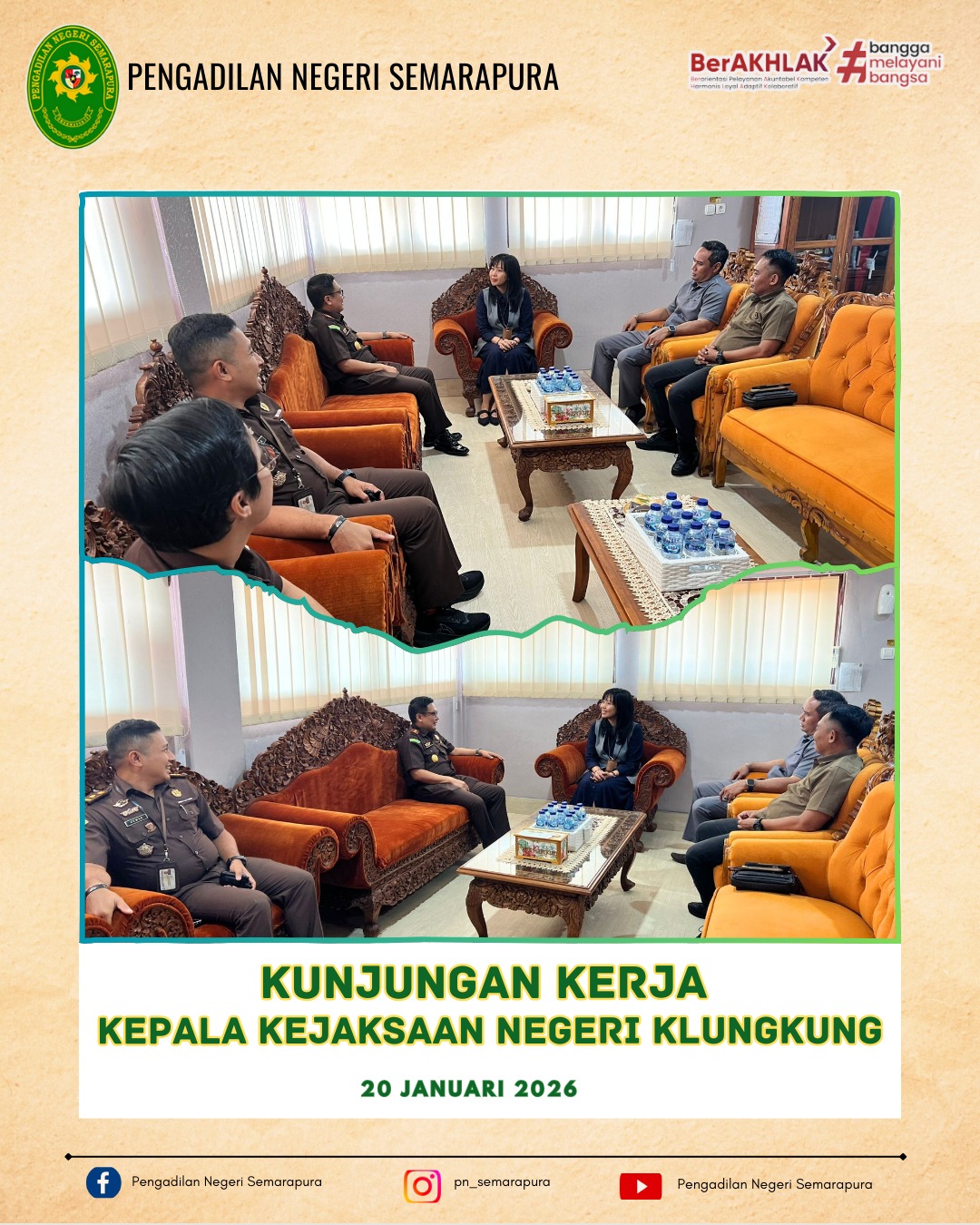 Ketua Pengadilan Negeri Semarapura Ibu Ratih Kusuma Wardhani, S.H.,M.H., didampingi Wakil Ketua Pengadilan Negeri Semarapura, menerima kunjugan kerja dari Kepala Kejaksaan Negeri Klungkung, bertempat di Ruang Ketua Pengadilan Negeri Semarapura.