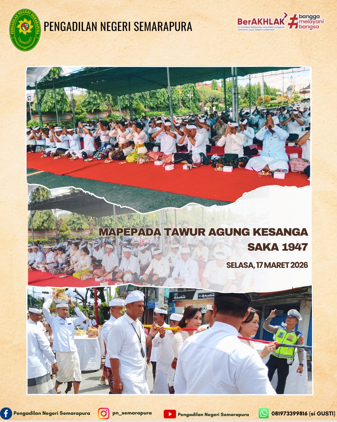 Wakil Ketua Pengadilan Negeri Semarapura, Bapak Anak Agung Putra Wiratjaya, S.H., M.H., menghadiri Kegiatan Mepepada Dalam rangka pelaksanaan Upacara Tawur Agung Kesanga Saka 1948 Tahun 2026 di Catus Pata Kabupaten Klungkung.
