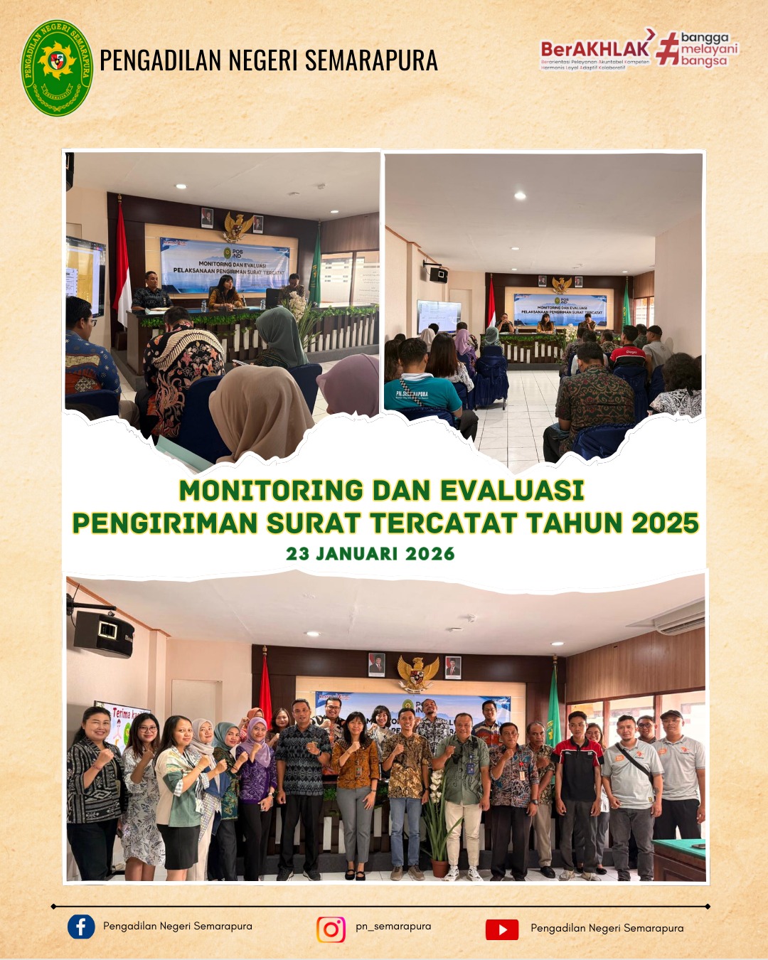 Ketua Pengadilan Negeri Semarapura, Ibu Ratih Kusuma Wardhani,S.H.,M.H. Beserta Hakim, Bagian Kepaniteraan dan Juru Sita Pengadilan Negeri Semarapura Melaksanakan Monitoring dan Evaluasi pengiriman Surat Tercatat Tahun 2025 Antara PT. Pos Cabang Gianyar dan Klungkung dengan Pengadilan Negeri Semarapura, Bertempat Di Ruang Rapat Kantor Pengadilan Negeri Semarapura.