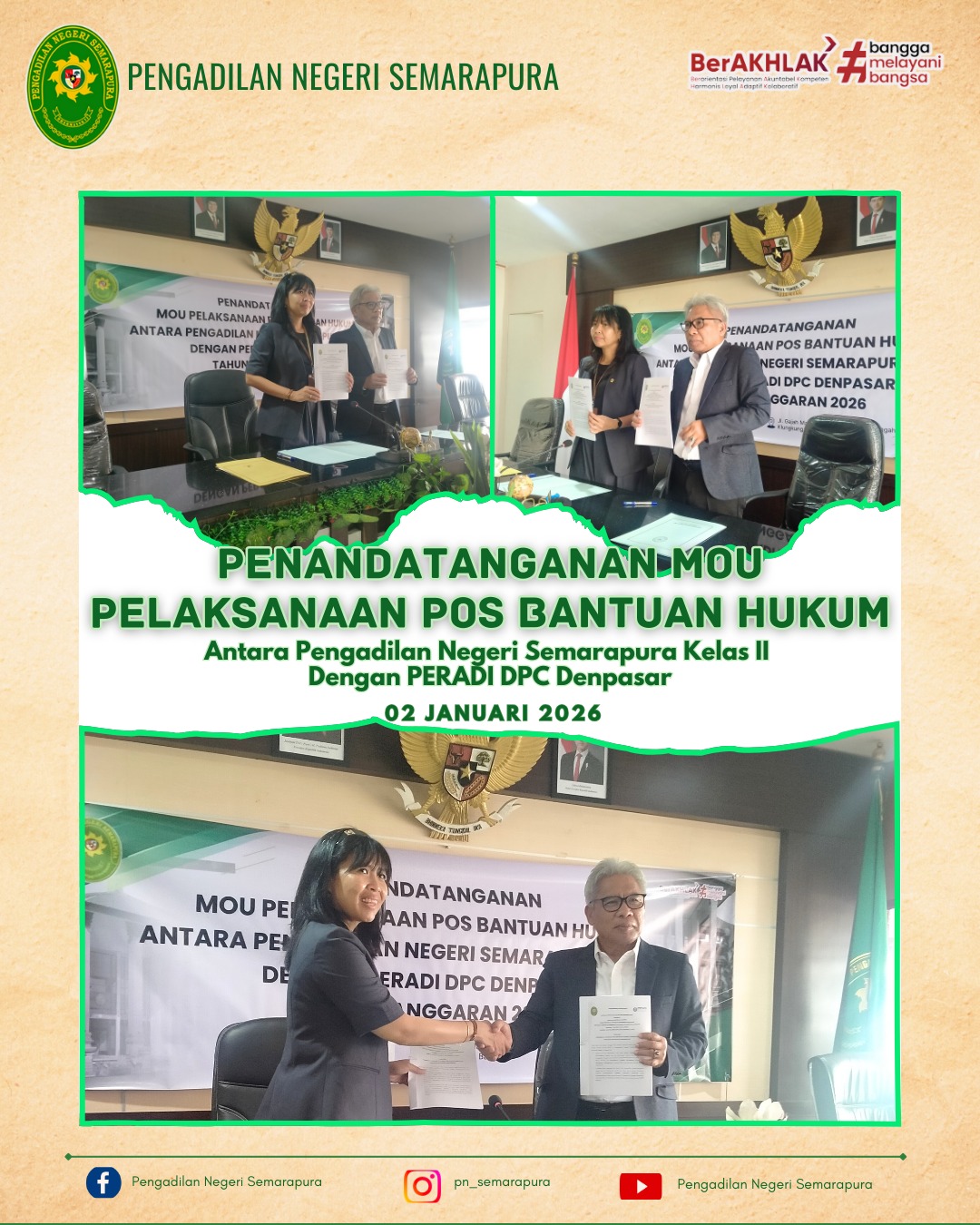 Ketua Pengadilan Negeri Semarapura Ibu Ratih Kusuma Wardhani, S.H.,M.H., melaksanakan kegiatan Penandatanganan MOU Pelaksanaan Pos Bantuan Hukum, antara Pengadilan Negeri Semarapura Kelas II dengan PERADI DPC Denpasar, bertempat di Ruang Rapat Pengadilan Negeri Semarapura.