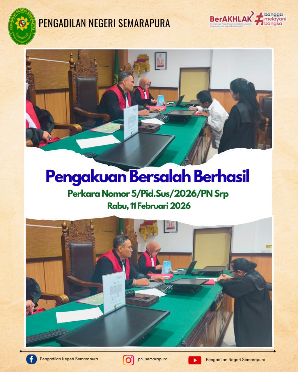 Telah dilaksanakan persidangan Pengakuan Bersalah Berhasil Perkara Nomor 5/Pid.Sus/2026/PN Srp, dengan majelis hakim, Bapak Anak Agung Putra Wiratjaya, S.H., M.H., hakim anggota Ibu Ika Masitawati, S.H., M.Kn dan Ibu Amirotul Azizah, S.H., M.H.