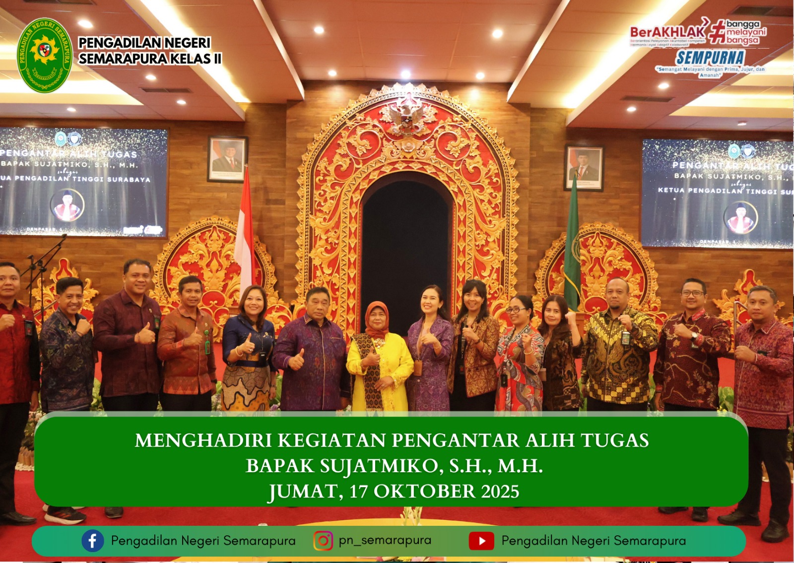 Ketua Pengadilan Negeri Semarapura Ibu A.A. Sagung Yuni Wulantrisna, S.H., beserta jajarannya, mengikuti kegiatan Pengantar Alih Tugas Bapak Sujatmiko, S.H.,M.H., yang diselenggarakan oleh Pengadilan Tinggi Denpasar, bertempat di Gedung Bale Agung Pengadilan Tinggi Denpasar.
