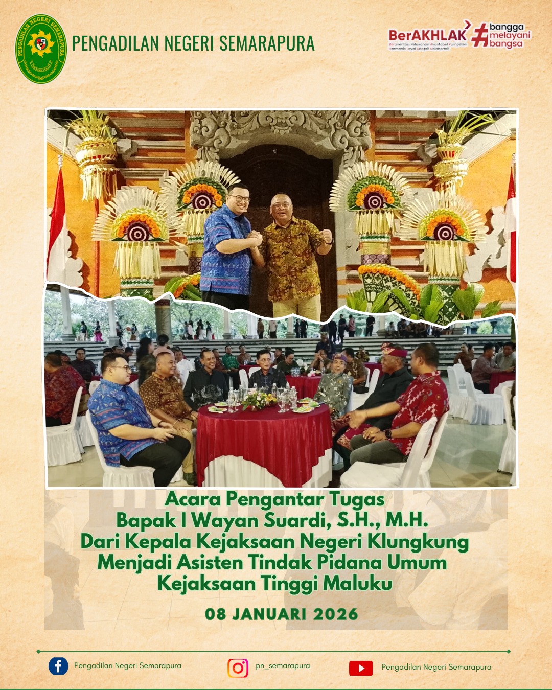 Ketua Pengadilan Negeri Semarapura, diwakili oleh Hakim Pengadilan Negeri Semarapura Bapak Hendra Abednego Halomoan Purba, S.H., menghadiri kegiatan Pengantar Tugas Bapak I Wayan Suardi, S.H.,M.H., dari Kepala Kejaksaan Negeri Klungkung menjadi Asisten Tindak Pidana Umum Kejaksaan Tinggi Maluku, acara berlangsung di Balai Budaya Ida Dewa Agung Istri Kanya, Semarapura.