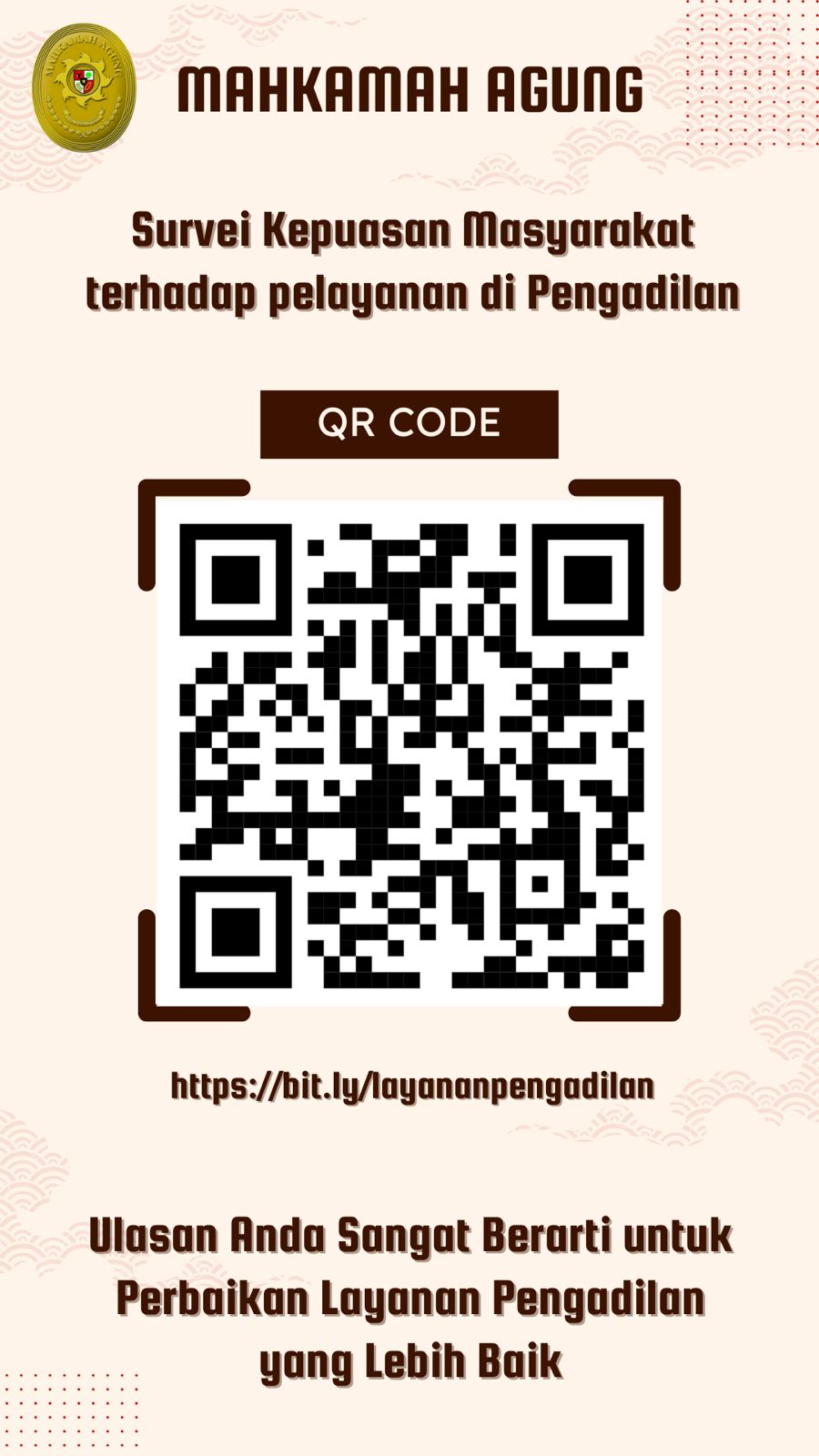 Dalam rangka mendukung pencapaian Indikator Sasaran Strategis RENSTRA Mahkamah Agung Tahun 2025-2029 yaitu “ Indeks Kepuasan Pengguna Layanan Pengadilan Berdasarkan Standar Layanan Yang Ditetapkan” dimohon kesediaannya pada masyarakat pencari keadilan untuk pengisian kuisioner dengan melakukan scan barcode, sejak tanggal 13 November 2025 s.d. 12 Desember 2025.