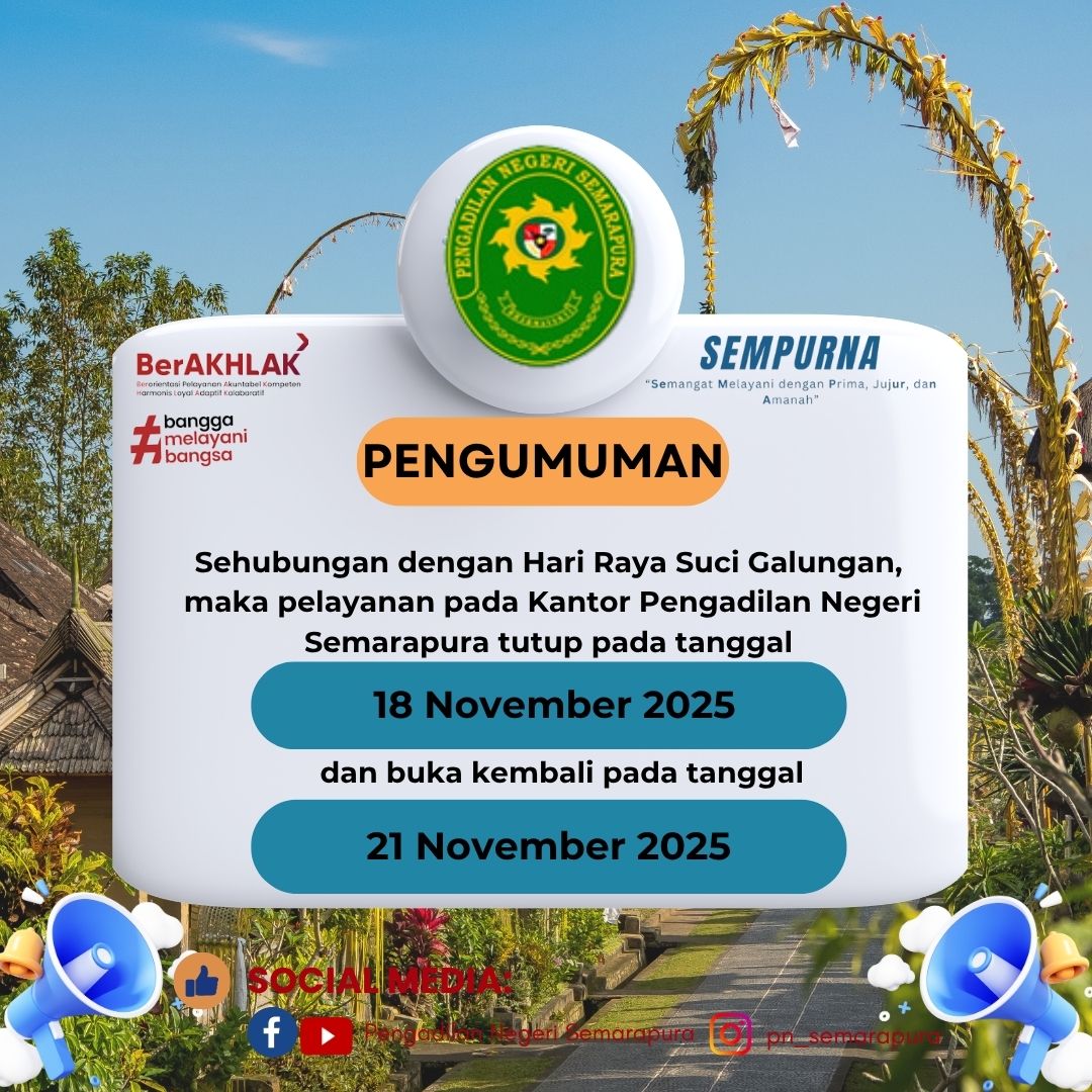 Dalam rangka libur memperingati Hari Raya Galungan, Pengadilan Negeri Semarapura tutup pada hari Selasa, 18 November 2025 s.d. Kamis, 20 November 2025. Pengadilan Negeri Semarapura akan buka kembali pada hari Jumat, 21 November 2025.