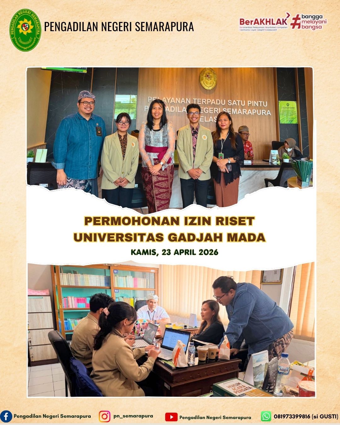 Ketua, Wakil Ketua, Para Hakim Pengadilan Negeri Semarapura menerima kunjungan mahasiswa Universitas Gadjah Mada dalam rangka Permohonan Izin Riset Akademis pada Pengadilan Negeri Semarapura guna penyusunan berkas perkara dalam kompetensi peradilan semu dengan topik Tindak Pidana Narkotika.