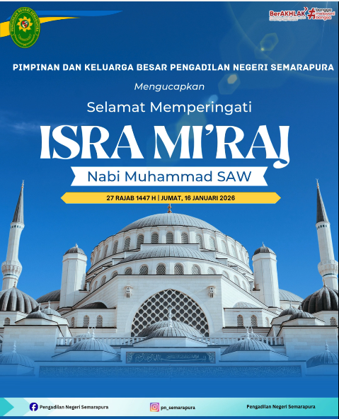 Pimpinan dan Keluarga Besar Pengadilan Negeri Semarapura mengucapkan Selamat Memperingati Isra Mi'raj Nabi Muhammad SAW 27 Rajab 1447 H, Jumat 16 Januari 2026.