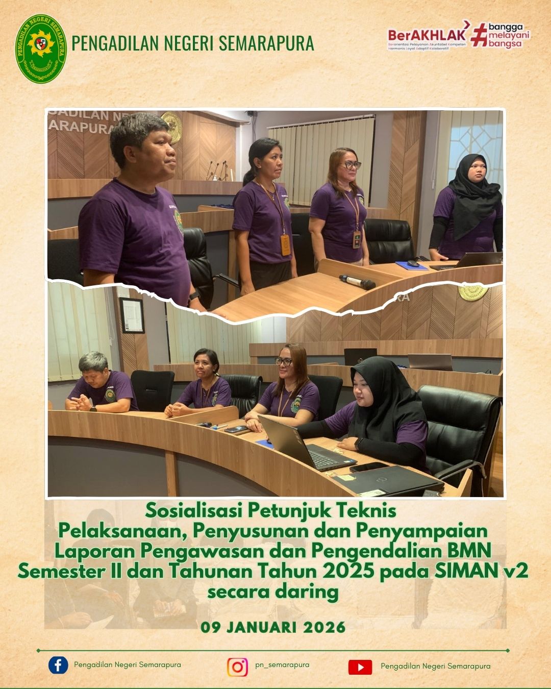 Sekretaris Pengadilan Negeri Semarapura Ibu Sopiah, S.H., beserta jajarannya, mengikuti Sosialisasi Petunjuk Teknis Pelaksanaan dan Penyampaian Laporan Pengawasan dan Pengendalian BMN Semester II Tahun 2025 pada SIMAN Versi 2, yang diselenggarakan oleh Badan Urusan Administrasi Mahkamah Agung R.I. secara daring.