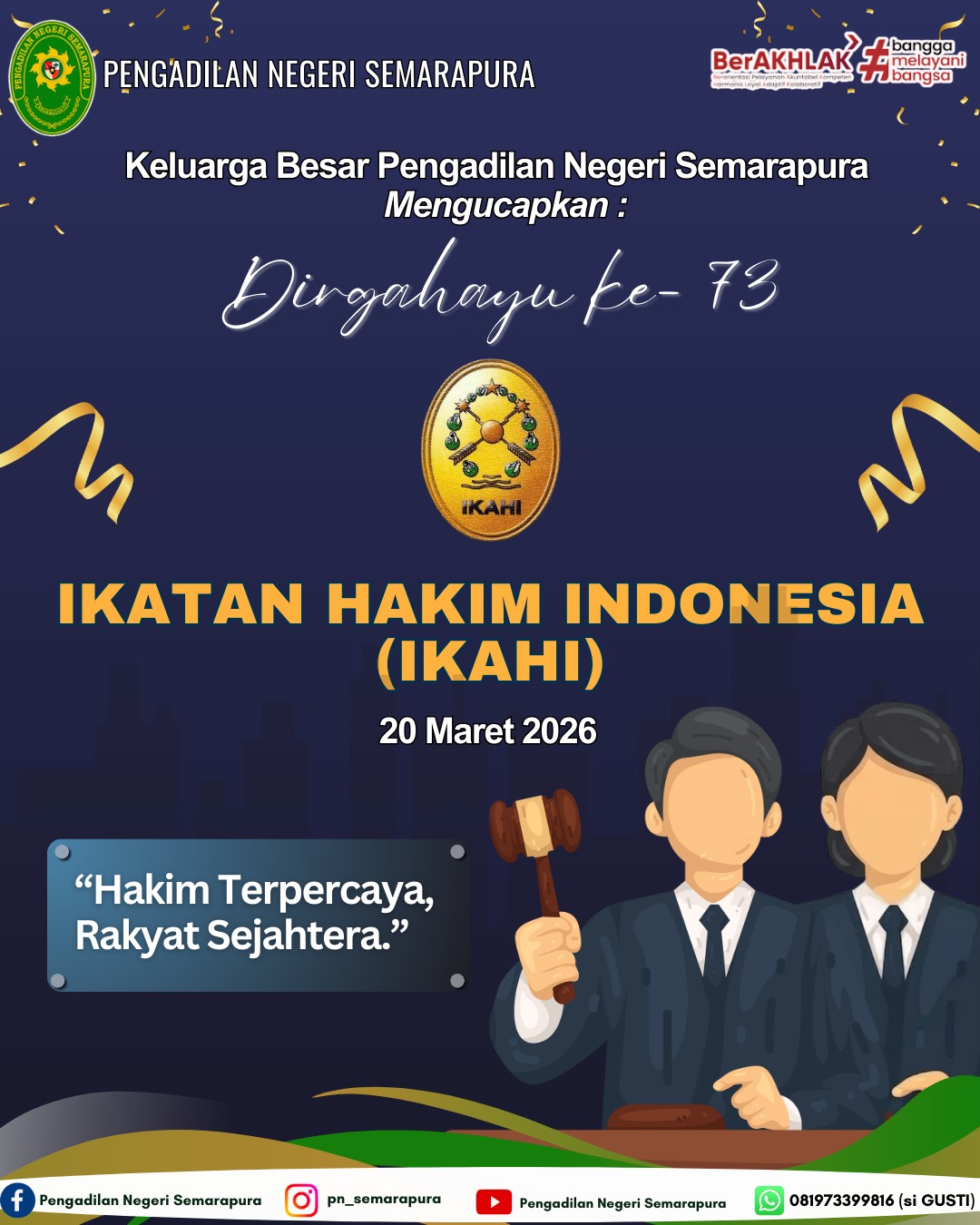 Pimpinan beserta keluarga besar Pengadilan Negeri Semarapura mengucapkan Dirgahayu ke-73 IKATAN HAKIM INDONESIA (IKAHI) Pada tanggal 20 Maret 2026.