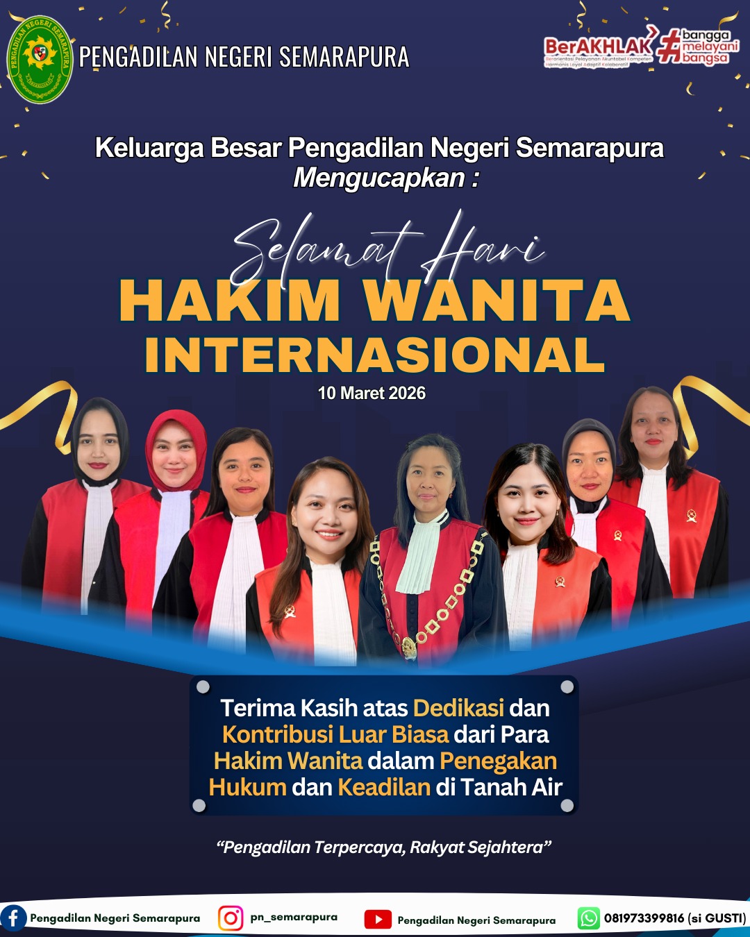 Keluarga Besar Pengadilan Negeri Semarapura mengucapkan Selamat Hari Hakim Wanita Internasional. Terima kasih atas dedikasi dan kontribusi luar biasa dari para hakim wanita dalam penegakan hukum dan keadilan di tanah air.
