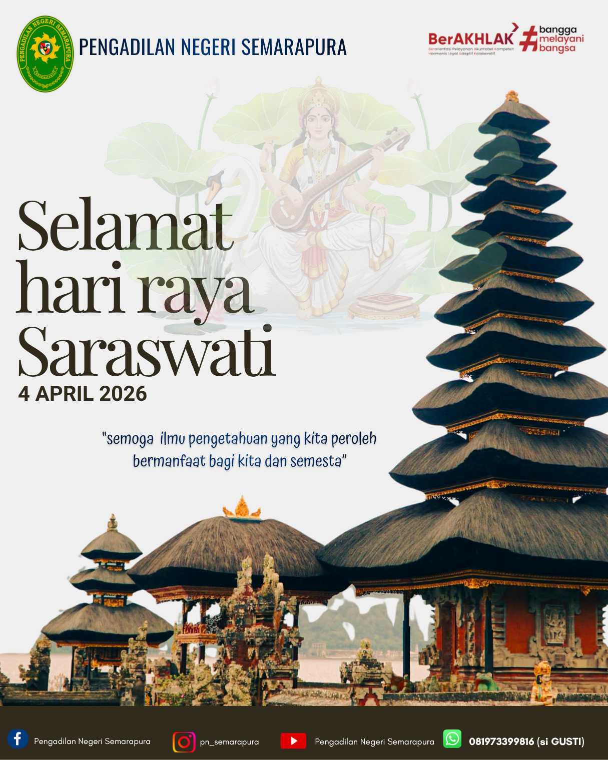 Pimpinan beserta keluarga besar Pengadilan Negeri Semarapura mengucapkan Selamat Hari Raya Saraswati "SEMOGA ILMU PENGETAHUAN YANG KITA PEROLEH BERMANFAAT BAGI KITA DAN SEMESTA"