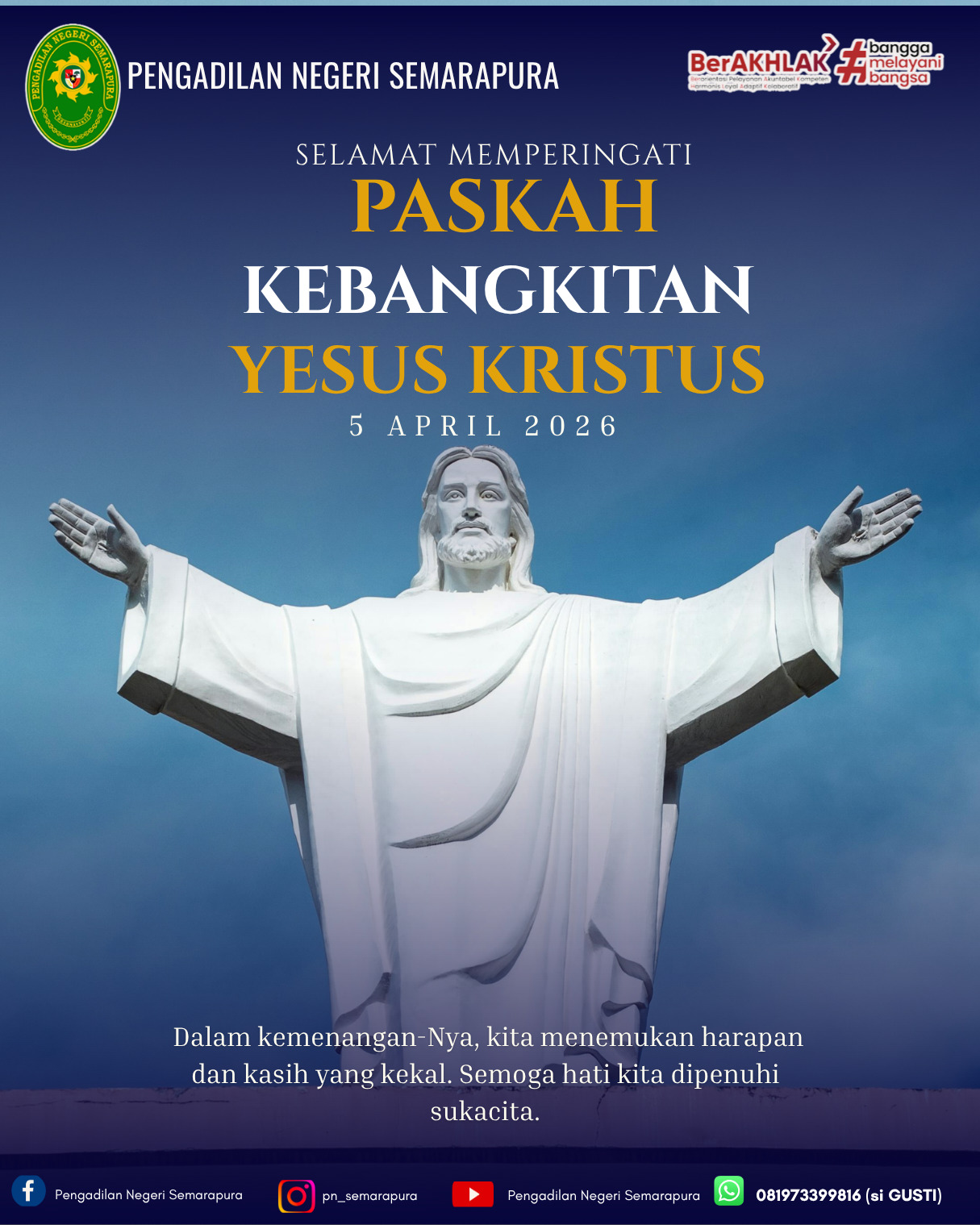 Pimpinan beserta keluarga besar Pengadilan Negeri Semarapura mengucapkan Selamat Memperingati Paskah, Kebangkitan Yesus Kristus pada tanggal 5 April 2026. “Dalam kemenangan-Nya, kita menemukan harapan dan kasih yang kekal. Semoga hati kita dipenuhi sukacita ”.