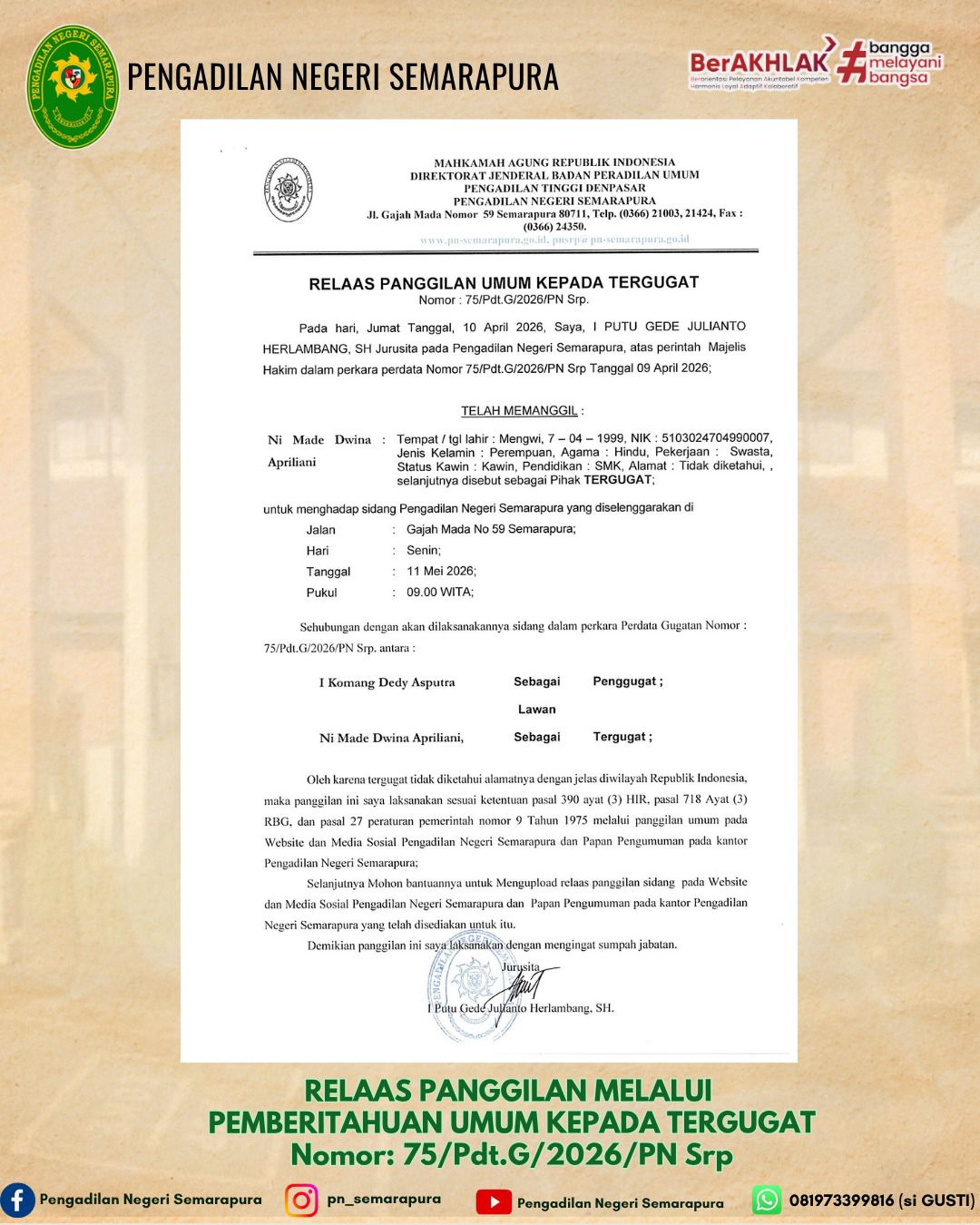 Relaas Panggilan Melalui Pemberitahuan Umum Kepada Tergugat Perkara Nomor 75/Pdt.G/2026/PN Srp.