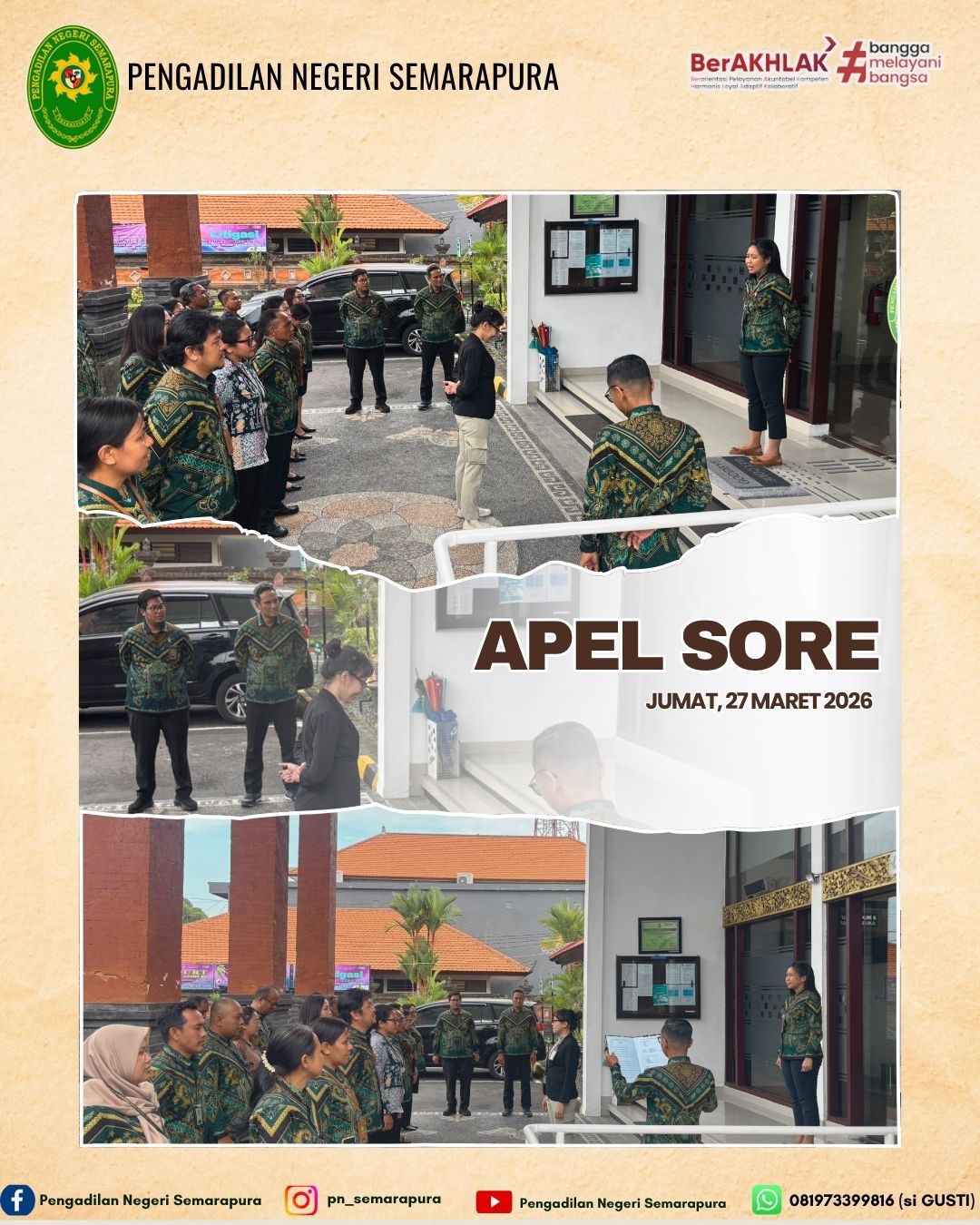 Pengadilan Negeri Semarapura melaksanakan Apel Sore dengan pembina apel Ketua Pengadilan Negeri Semarapura, Ibu Ratih Kusuma Wardhani, S.H., M.H., dan petugas apel dari Kepaniteraan Perdata. Apel dilaksanakan pada Halaman Depan Kantor Pengadilan Negeri Semarapura.
