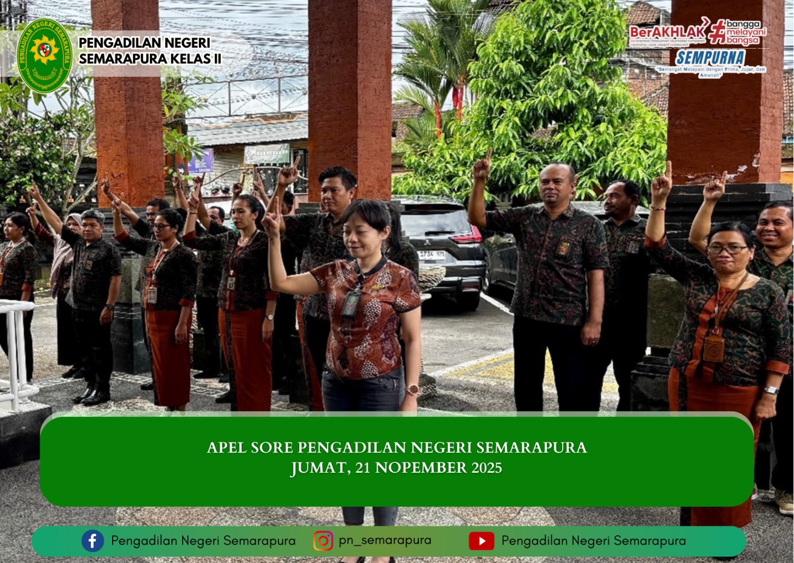 Bertempat di halaman kantor Pengadilan Negeri Semarapura telah dilaksanakan Apel Sore, sebagai Pembina Apel Hakim Pengadilan Negeri Semarapura Bapak Nanda Riwanto, S.H.,M.H., sebagai Petugas Apel adalah bagian Kepaniteraan Perdata. Apel diikuti oleh seluruh Hakim dan Aparatur Pengadilan Negeri Semarapura. Dalam amanatnya pembina apel menyampaikan selamat berakhir pekan, tetap disiplin dan selalu mematuhi PERMA Nomor 7,8,9 Tahun 2016, serta selalu menerapkan Delapan Nilai Utama Mahkamah Agung RI, dan tetap berpedoman kepada Core Value ASN BERAKHLAK.