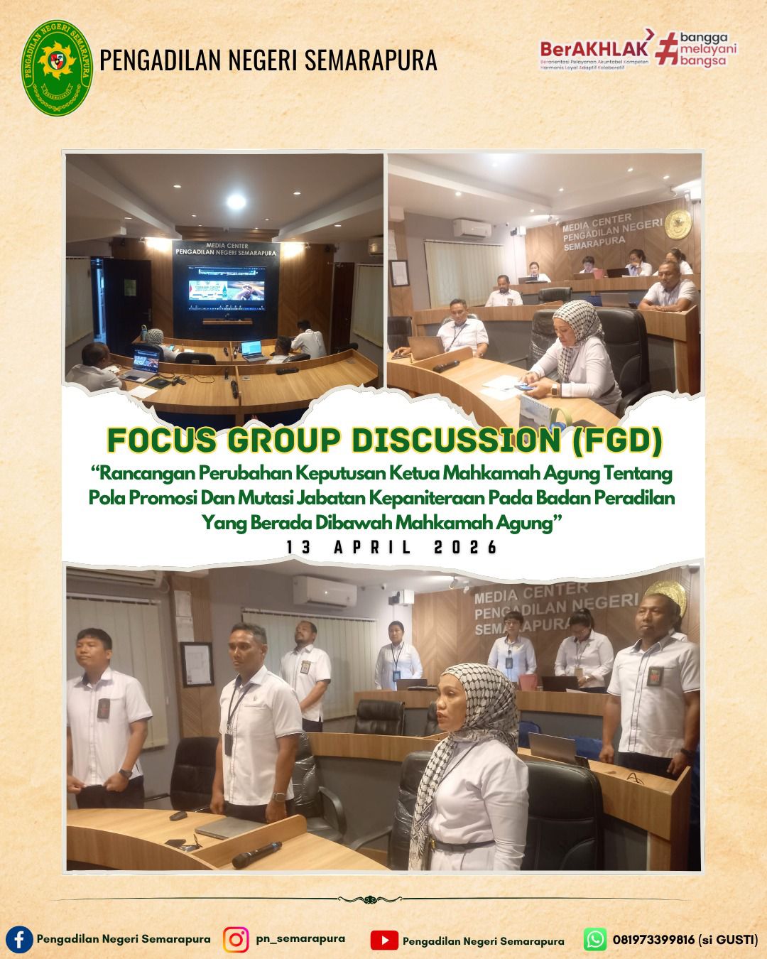 Wakil Ketua Pengadilan Negeri Semarapura Bapak ANAK AGUNG PUTRA WIRATJAYA, S.H., M.H., Panitera, Para Panitera Muda, Panitera Pengganti dan Juru sita mengikuti kegiatan focus Group Discussion (FGD) berjudul Rancangan Perubahan Keputusan Ketua Mahkamah Agung Tentang Pola Promosi dan Mutasi Jabatan Kepaniteraan Pada Badan Peradilan yang Berada Dibawah Mahkamah Agung. Acara tersebut berlangsung secara daring dan bertempat di Ruang Media Center Pengadilan Negeri Semarapura.