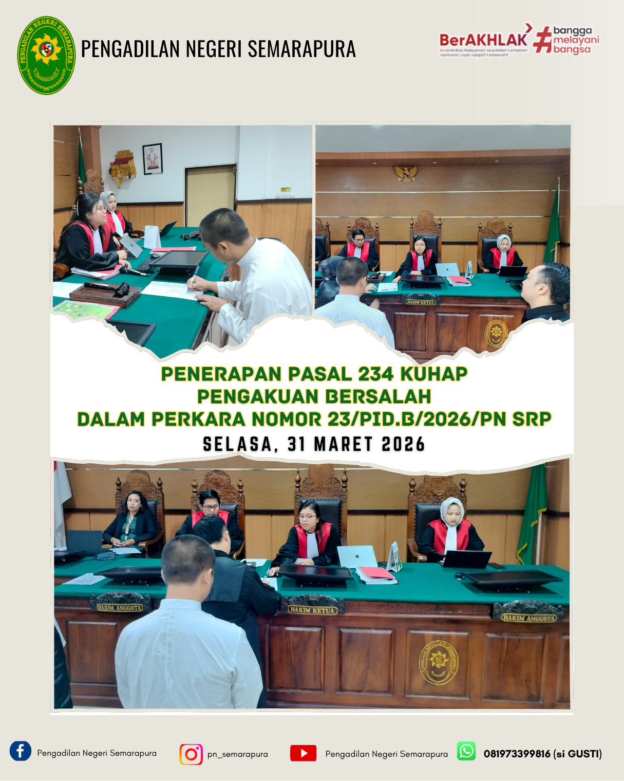 Persidangan pada Pengadilan Negeri Semarapura dengan Penerapan Pasal 234 KUHAP Pengakuan Bersalah dalam Perkara Nomor 23/Pid.B/2026/PN Srp