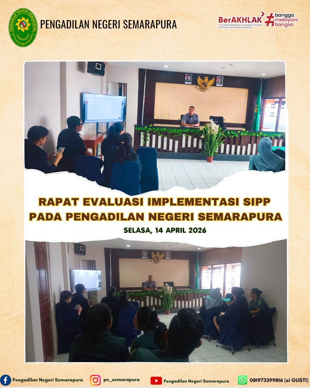 Bertempat di Ruang Rapat Pengadilan Negeri Semarapura, Wakil Pengadilan Negeri Semarapura Bapak Anak Agung Putra Wiratjaya, S.H.,M.H., memimpin pelaksanaan Rapat Evaluasi Implementasi SIPP pada Pengadilan Negeri Semarapura. Rapat membahas Tentang Sinkronisasi SIPP Agar Segera di Updite.