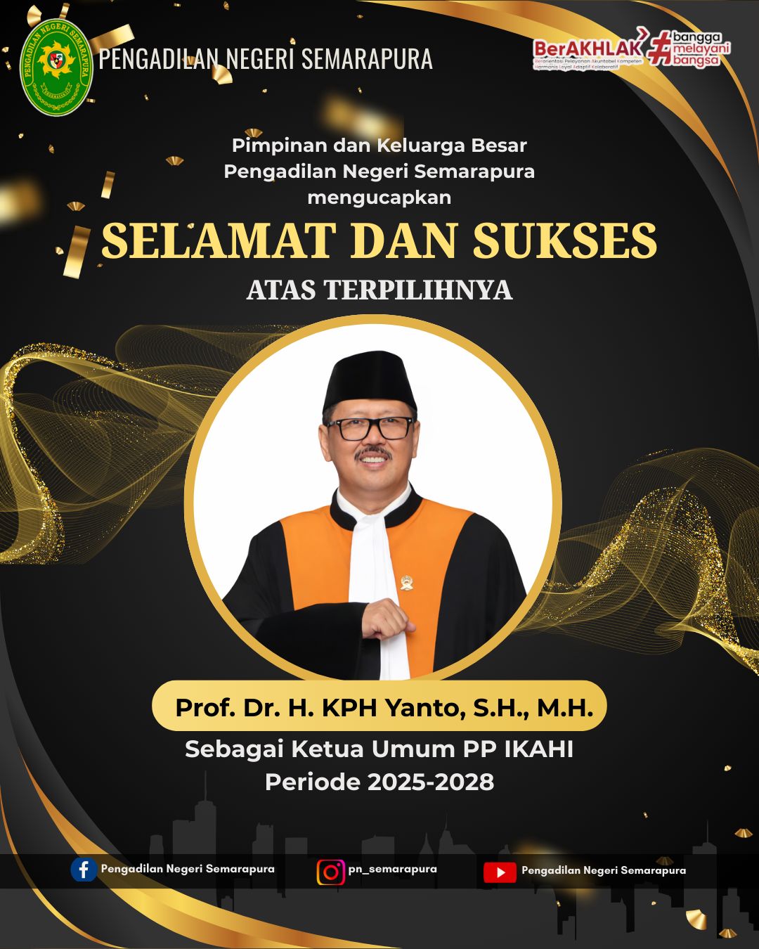 Pimpinan dan Keluarga Besar Pengadilan Negeri Semarapura mengucapkan Selamat dan Sukses atas terpilihnya Prof. Dr. Yanto, S.H., M.H. sebagai Ketua Umum PP IKAHI Periode 2025–2028.