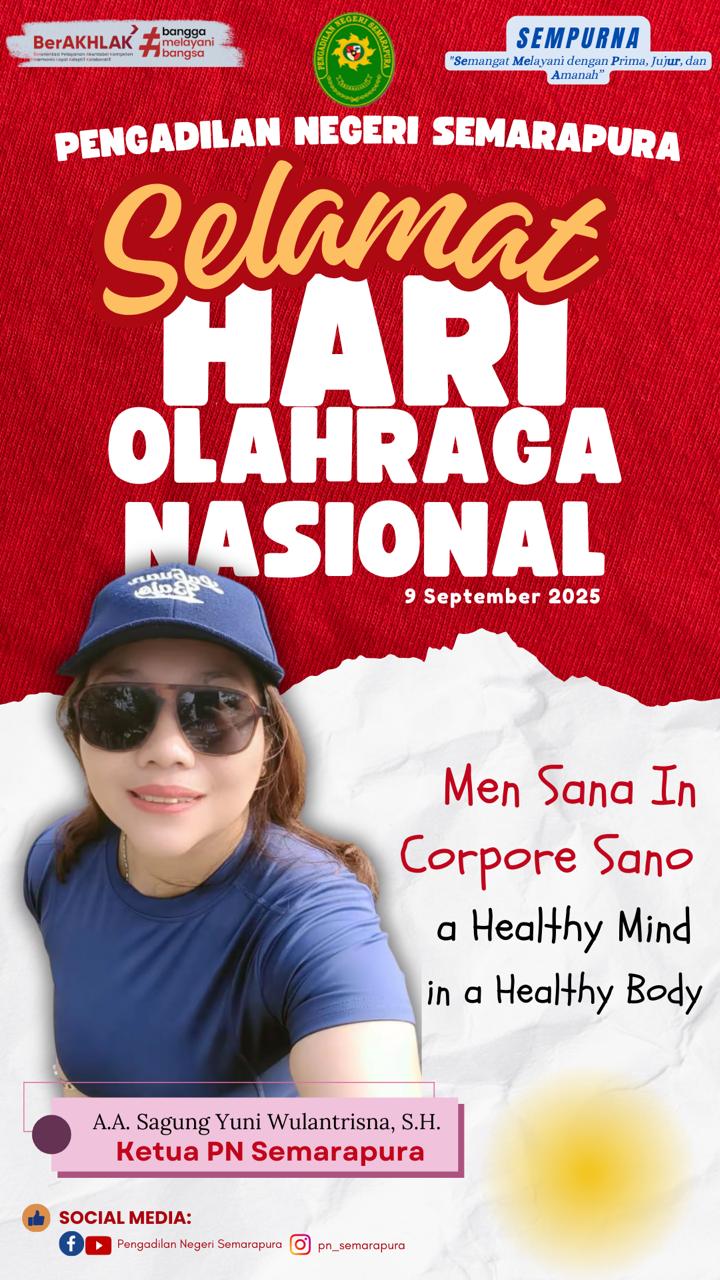Pimpinan dan Keluarga Besar Pengadilan Negeri Semarapura mengucapkan Selamat Hari Olahraga Nasional. Men Sana In Corpore Sano. A Healthy Mind In A Healthy Body.