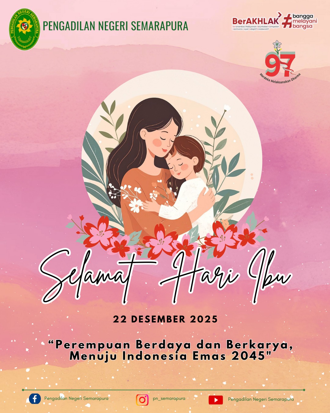 Pimpinan beserta keluarga besar Pengadilan Negeri Semarapura mengucapkan Selamat Memperingati Hari Ibu, pada tanggal 22 Desember 2025. “Perempuan Berdaya dan Berkarya, Menuju Indonesia Emas 2045”.