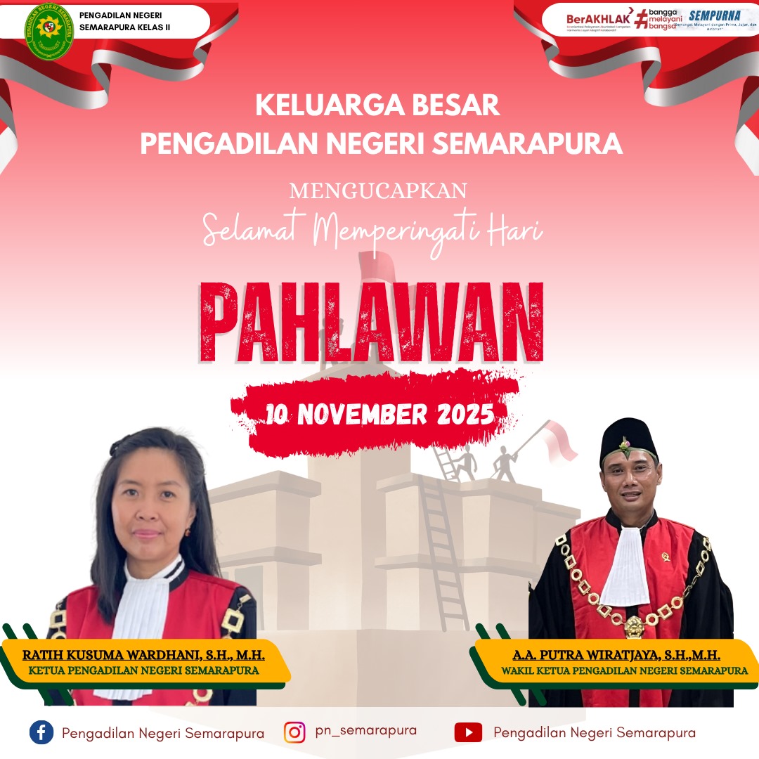 Pimpinan beserta keluarga besar Pengadilan Negeri Semarapura mengucapkan Selamat Memperingati Hari Pahlawan pada Senin, 10 November 2025, “Pahlawan Teladanku, Terus Bergerak, Melanjutkan Perjuangan”.