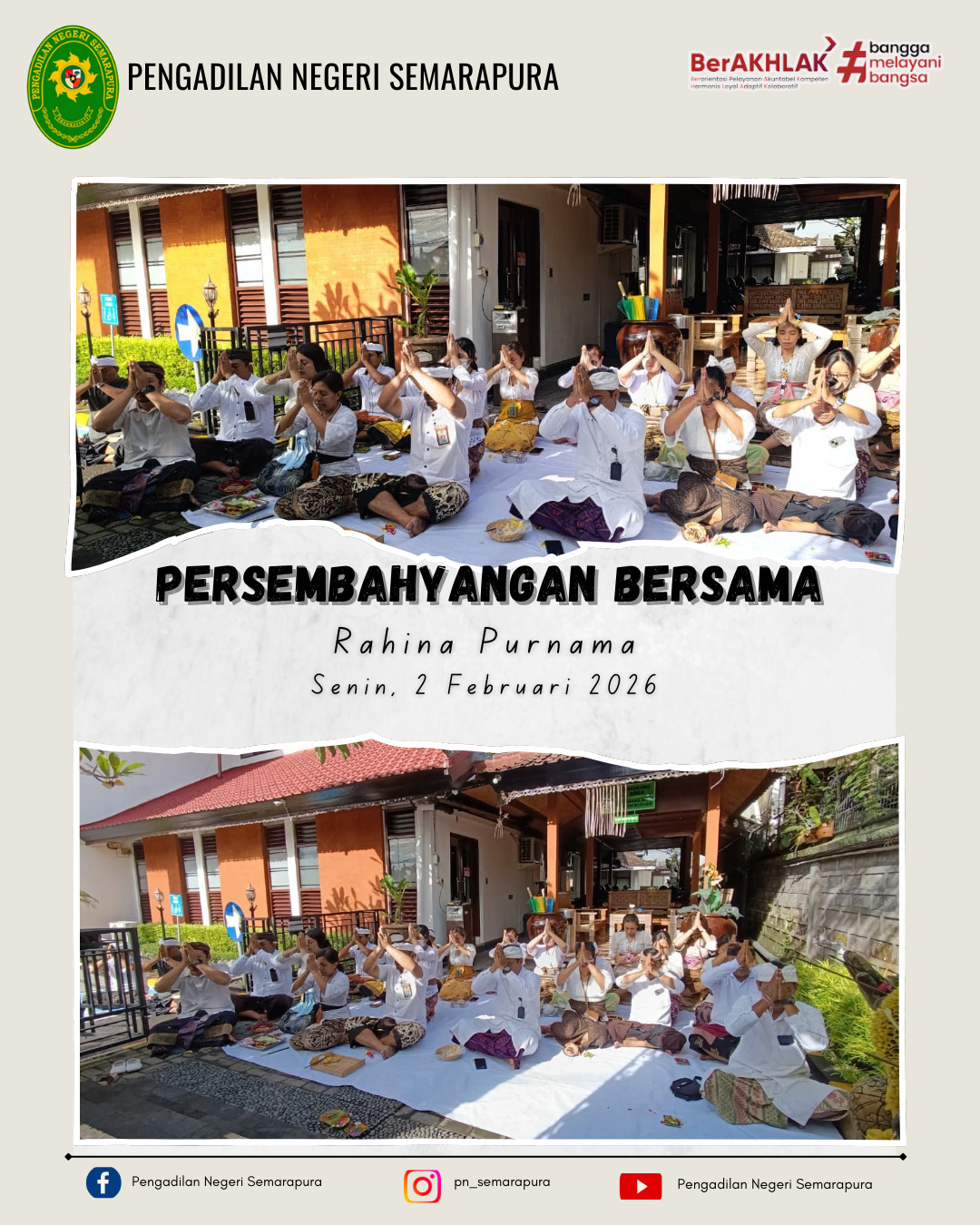 Keluarga besar Pengadilan Negeri Semarapura melaksanakan kegiatan persembahyangan bersama dalam rangka Hari Purnama pada Padmasana Pengadilan Negeri Semarapura.